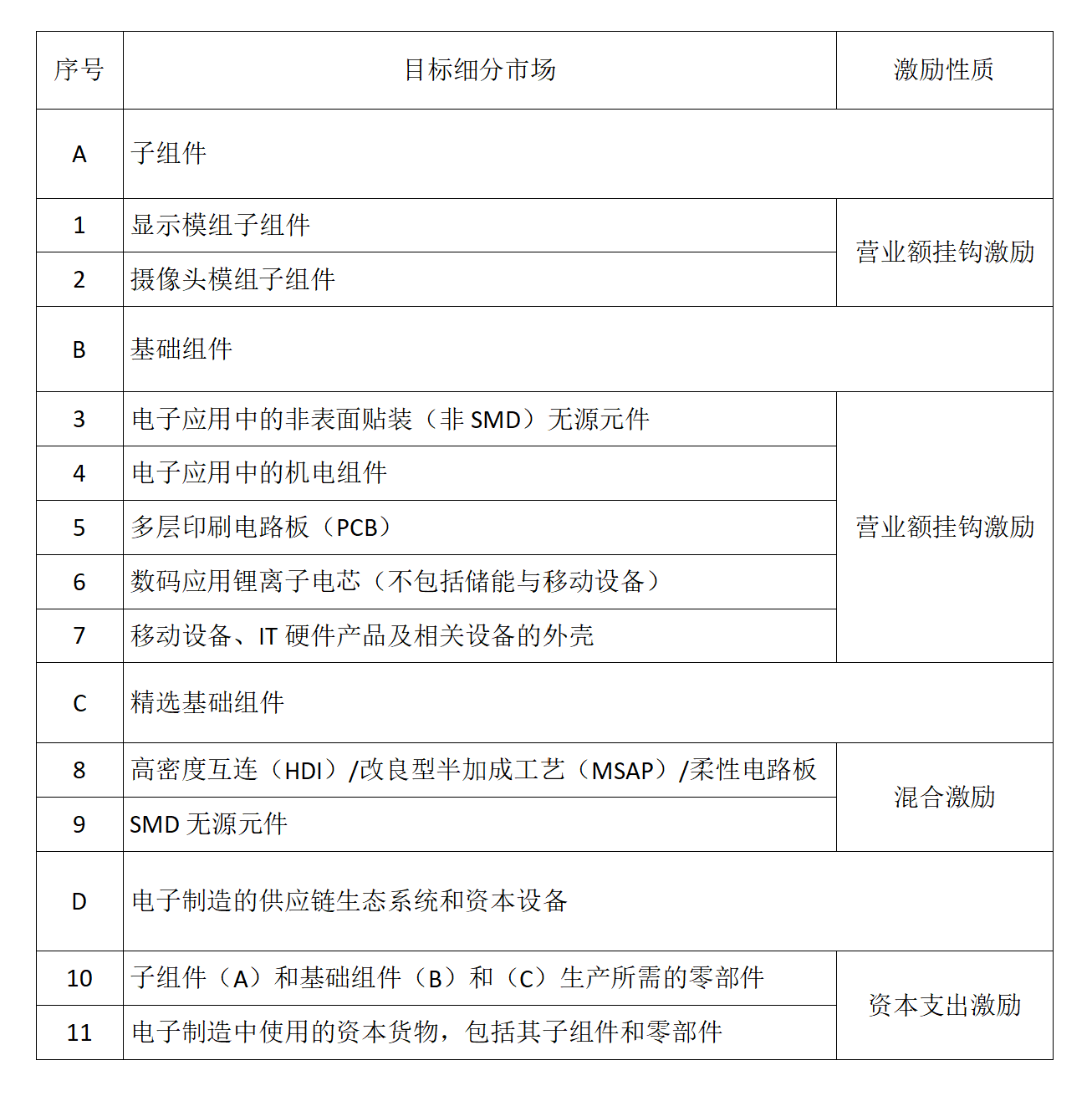 该计划涵盖的目标细分市场和相应的激励措施如下: